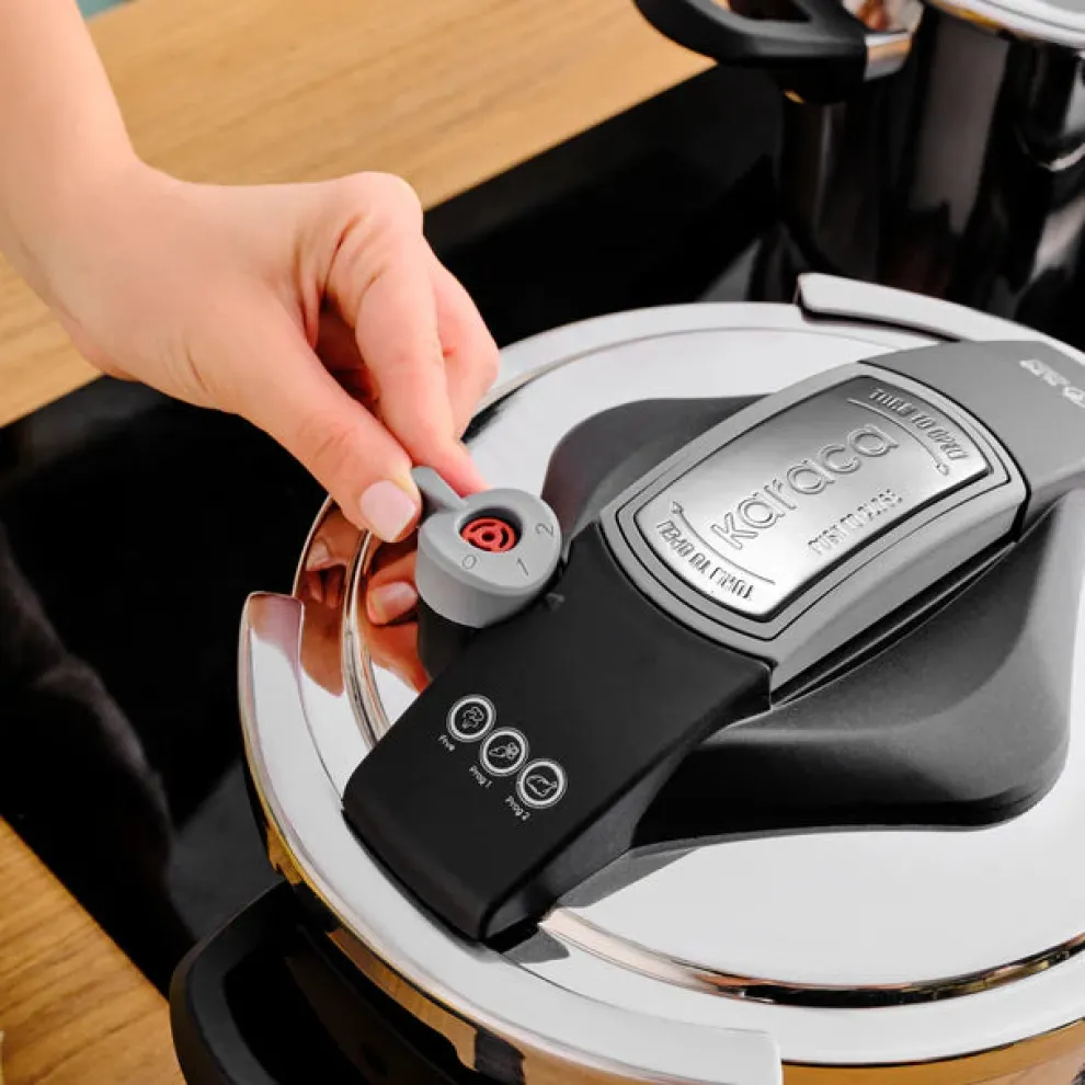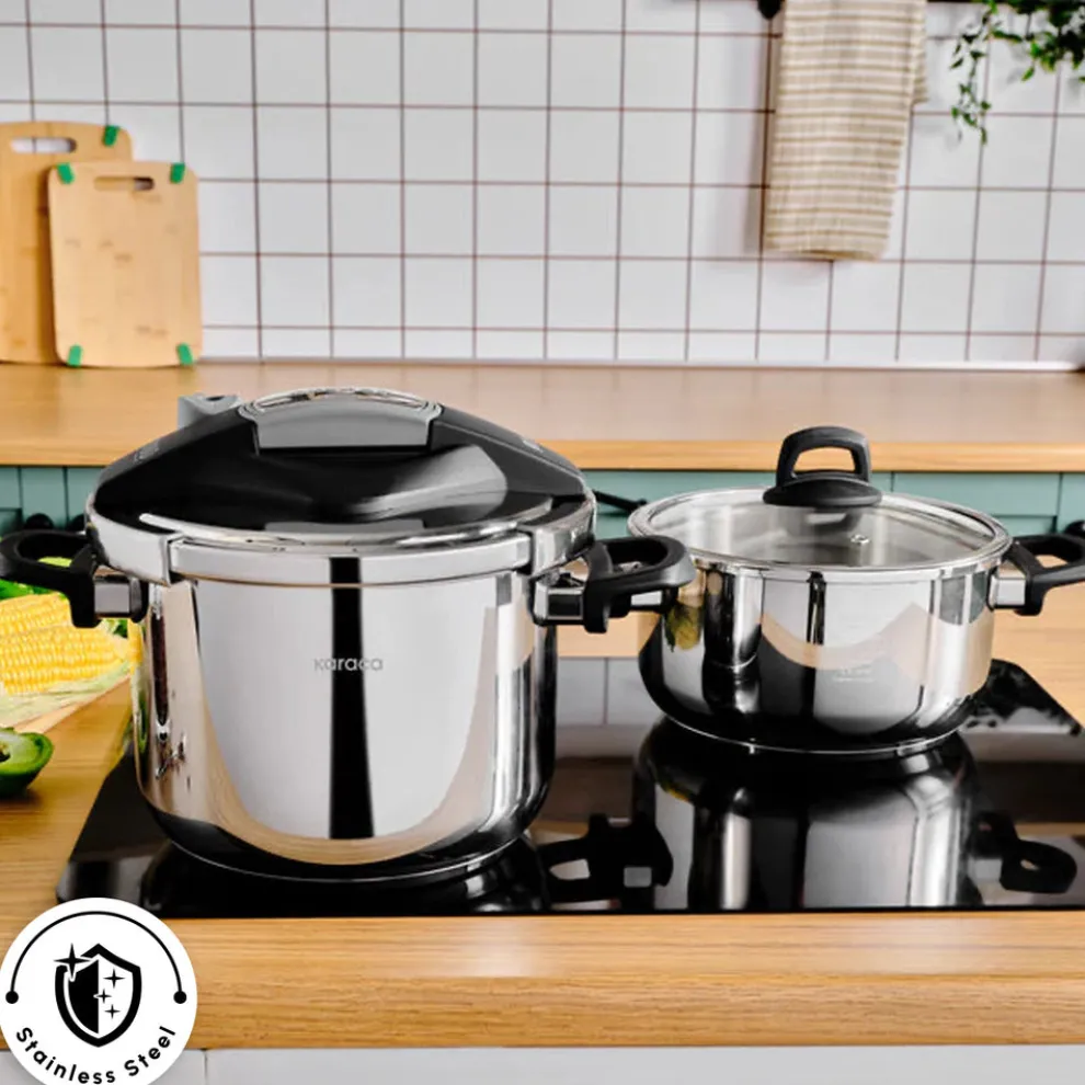 Karaca Perfect Stainless Steel Induction Pressure Cooker Set, which is made of 18/10 stainless steel, are durable and elegant. Thanks to its safety system, it provides safe and easy use. Thanks to it’s corrosion resistance, it is suitable for daily use. It is resistant to high temperature. It saves time and energy. Thanks to the cooking program, it regulates the cooking temperatures while cooking vegetables, meat, fish and legumes, thus preserving the vitamins and flavors of the foods. Different and ergonomic opening and closing system is easy, fast and safe. Thanks to its improved base system, it provides equal heat distribution and is suitable for use on all stoves, including induction. 2 Years Warranty. It can be washed in the dishwasher.