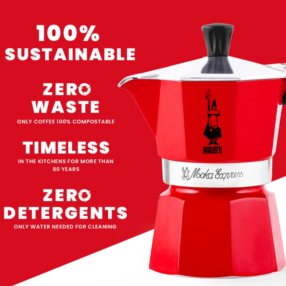 The Bialetti Moka Express is the original coffee maker, a true symbol of Made in Italy quality, offering the authentic Italian ritual of preparing a perfect cup of coffee. First created by Alfonso Bialetti in 1933, its unique design has become iconic, featuring the famous Man with the Moustache. Now also available in red!