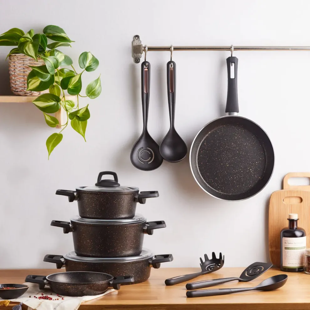 Karaca Blackgold Biogranite 13-Piece Induction Cookware Set with Kitchen Utensil Set, Black Gold