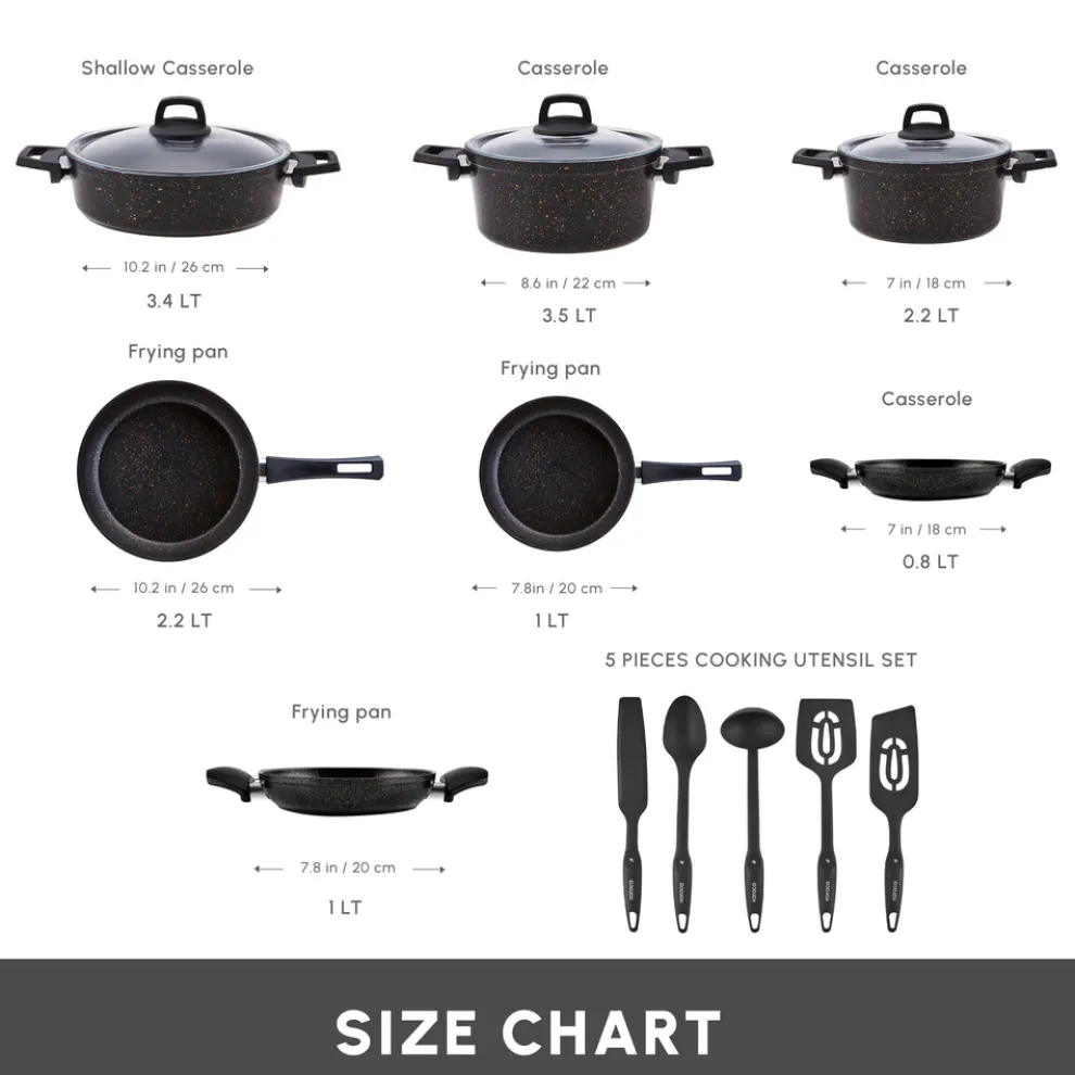 This set includes an 18 cm casserole with lid, 22 cm casserole with lid, 26 cm shallow casserole with lid, 26 cm frying pan, 20 cm frying pan, 20 cm dual-handle frying pan, and an 18 cm dual-handle frying pan. Additionally, it comes with a 5-piece cooking utensil set. Each piece is designed to meet various cooking needs, ensuring a well-equipped kitchen.