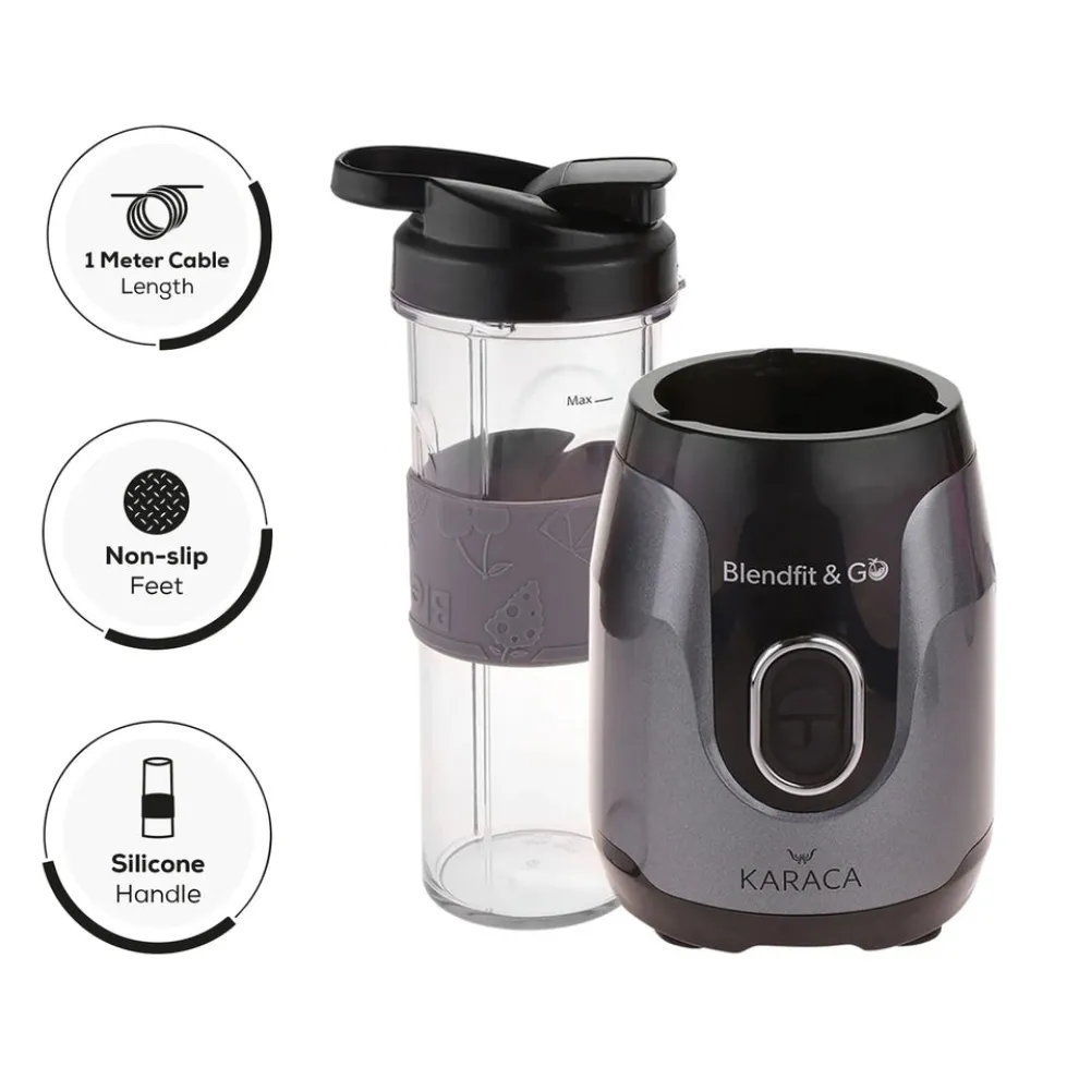It is very easy to prepare delicious mixes with Karaca Blendfit Go Personal Smoothie Blender. Moreover, it is very practical that you can carry it with you thanks to its leak-proof bottle and storage lid. The carrying ring on the storage cover prevents dripping. It is extremely easy to use, works with one button. Easily carried by hand with the silicone handle thanks to its ergonomic design. It provides safe use with its safe working system. Besides being able to prepare healthy, delicious and fun drinks, you can also make refreshing drinks thanks to the ice crushing feature. This stainless steel four-blade blender is durable and extremely practical. With its 4 stainless steel blades, you can quickly chop and mix both foods and iced mixes. Your drinks are now much healthier and more delicious with this personal blender!