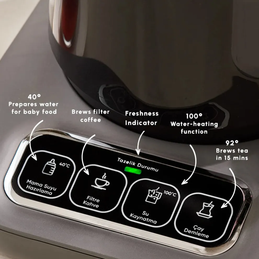 With the Caysever Robotea Pro, which has different heating levels, you can prepare the ideal food for your baby at 40 degrees, boil water at 100 degrees and prepare delicious herbal teas and hot drinks. You can also enjoy 40 minutes of fresh coffee by brewing filter coffee with the Caysever Robotea Pro.