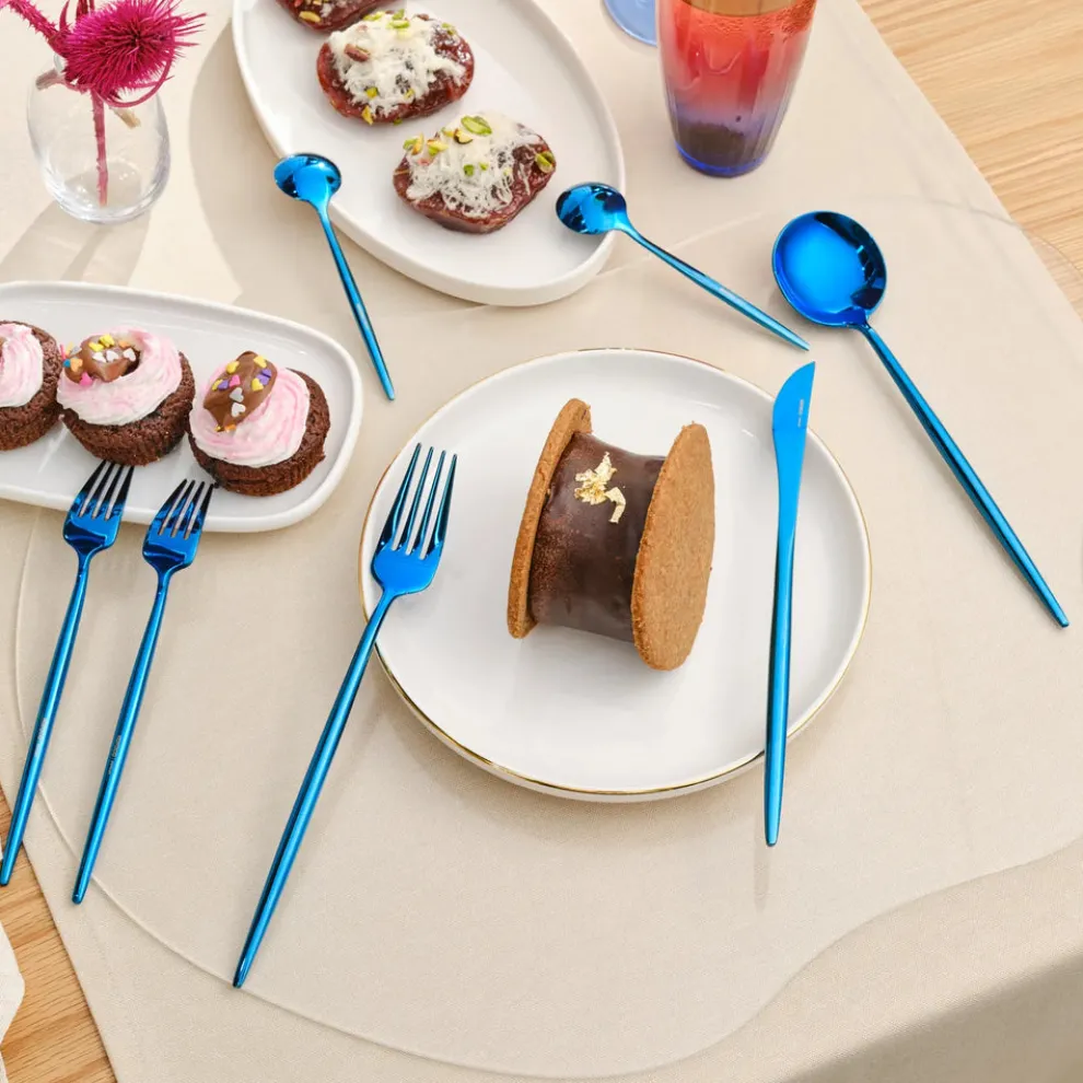 The sleek blue finish adds a touch of sophistication to your table setting. The elegant design is versatile, complementing both contemporary and traditional dining decor. This cutlery set is perfect for those who appreciate timeless style and quality craftsmanship.