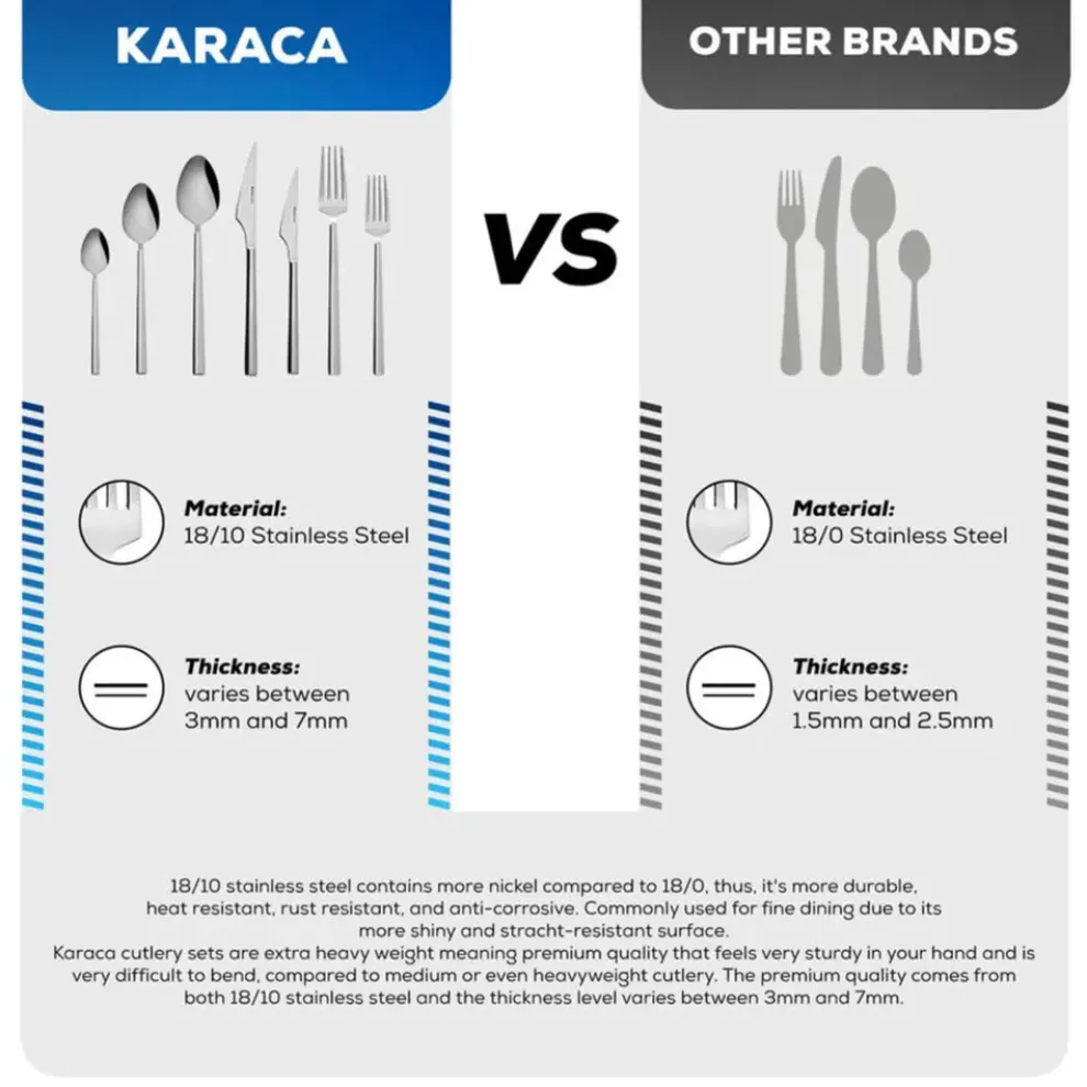 18/10 stainless steel contains more nickel compared to 18/0, thus, it’s it’s more durable, heat resistant, rust resistant, and anti-corrosive. Commonly used for fine dining due to its more shiny and stracht-resistant surface. Karaca cutlery sets are extra heavy weight meaning Premium quality that feels very sturdy in your hand and is very difficult to bend, compared to medium or even heavyweight cutlery. The Premium quality comes from both 18/10 stainless steel and the thickness level varies between 3mm and 7mm.
