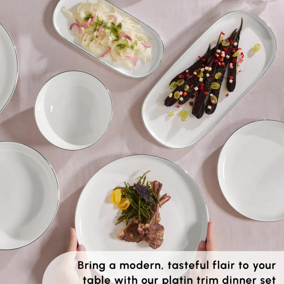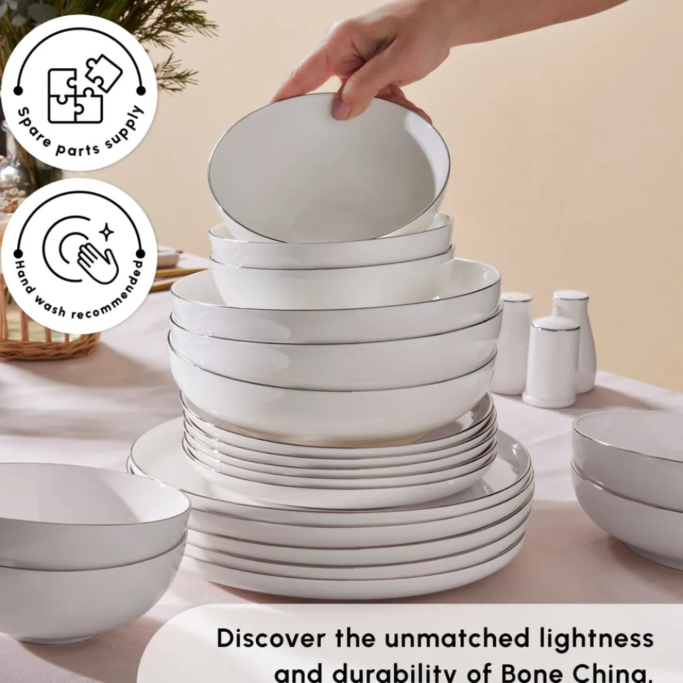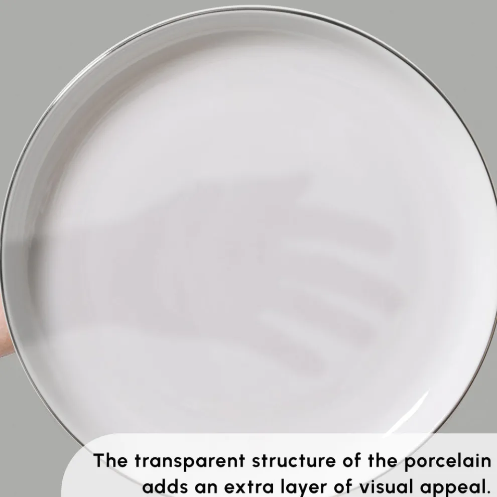 Crafted from genuine Bone China, this elegant dinnerware set offers a whiter, finer yet highly durable structure. Perfect for both everyday meals and special occasions, it brings a refined touch to any table setting. With its translucent whiteness and smooth surface, the collection combines quality with timeless style. Its distinctive design details create a sophisticated aesthetic, making it a versatile choice that complements both modern interiors and classic dining tables.