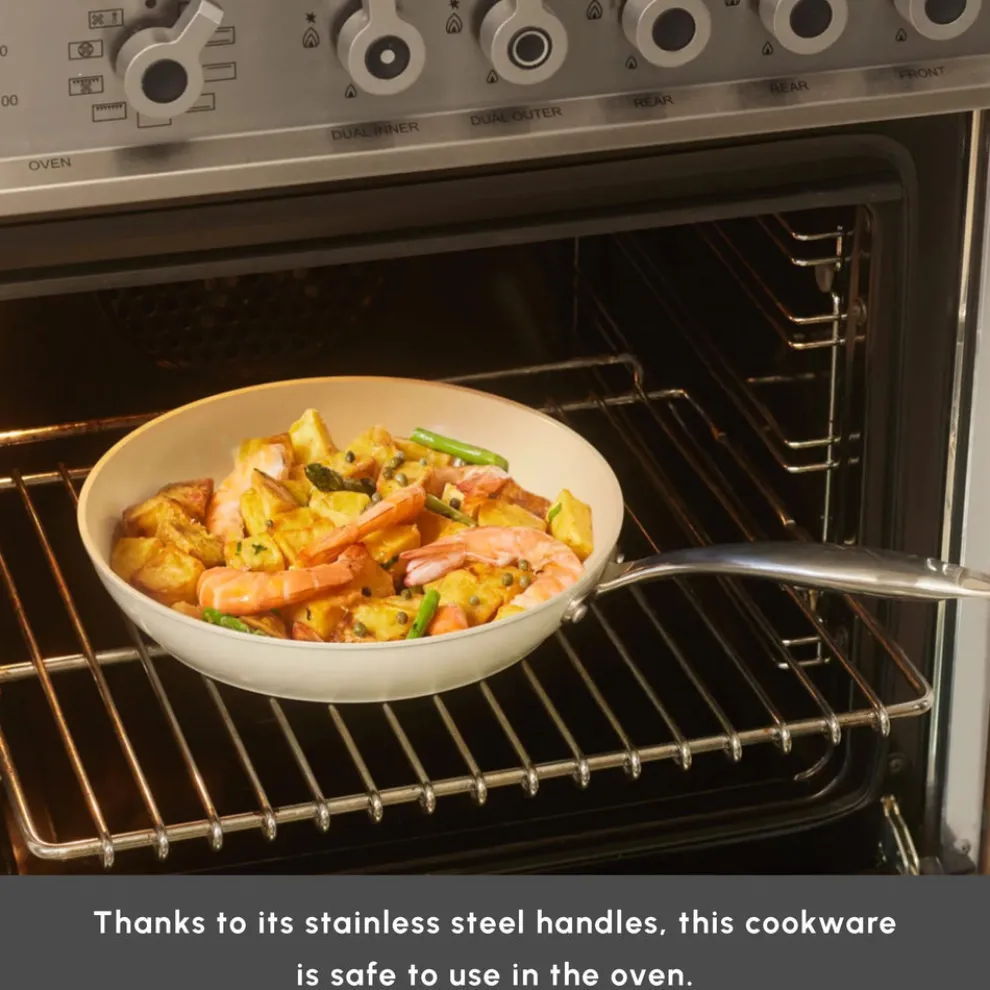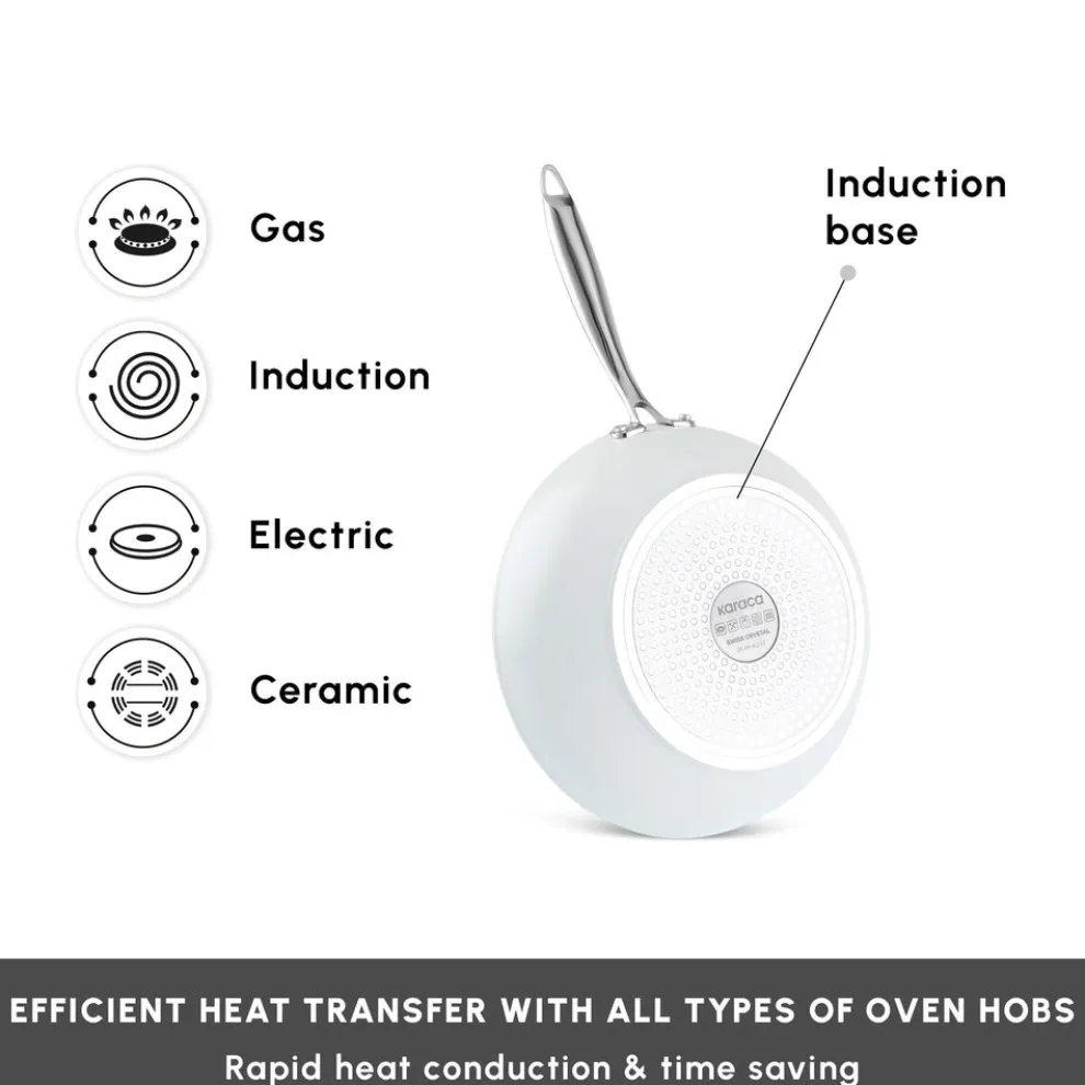 A brand-new pan set with superior non-stick qualities: SwissCrystal. Drawing its strength from the advanced non-stick SwissCrystal surface, the Karaca SwissCrystal Pan Set allows you to cook a wide variety of dishes – from eggs and fish to chicken – without the need for oil. The surface, infused with Swiss crystals, is free from potentially harmful chemical compounds such as PFAS, ensuring a healthier cooking experience. It’s also remarkably easy to clean – a brief soak in water is often all it takes. Designed with both practicality and performance in mind, this durable set is suitable for use in the oven, allowing you to effortlessly transition from hob to oven when preparing a variety of meals, and giving you even more versatility in your everyday cooking.
