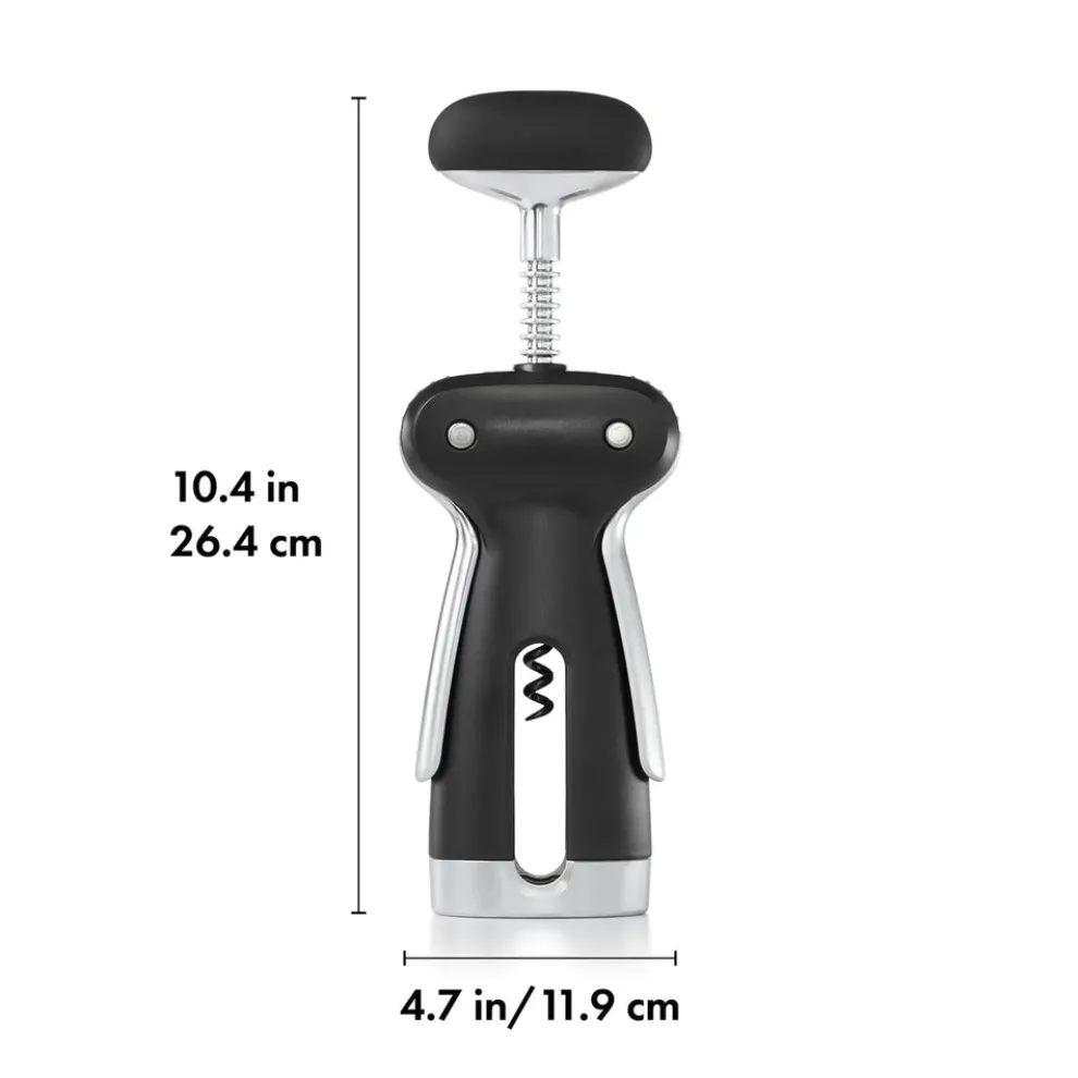 From huge holiday parties to intimate dinners, the OXO SteeL Winged Corkscrew with Removable Foil Cutter is the only tool you need to keep the wine flowing. A Removable Foil Cutter detaches from the Corkscrew’s base for quick bottle-top prep. The Corkscrew includes a non-stick, self-centering “worm” that glides into any type of cork. The extended body is comfortable to hold and the pair of curved, die-cast handles won’t hurt your hands. The soft non-slip knob turns smoothly, removing the cork without breakage. Also great for bottles of oil or vinegar.